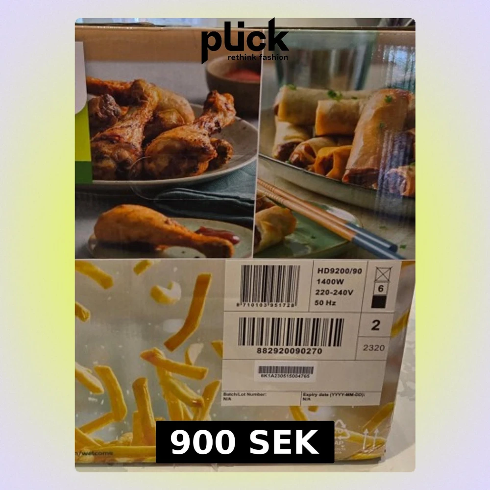 Säljer en svart Philips Airfryer HD9200/90 med 1400W effekt. Den har två vred för timer och temperatur, och är perfekt för att laga pommes, kyckling och vårrullar utan olja. Modern design i plast och enkel att använda i köket.
