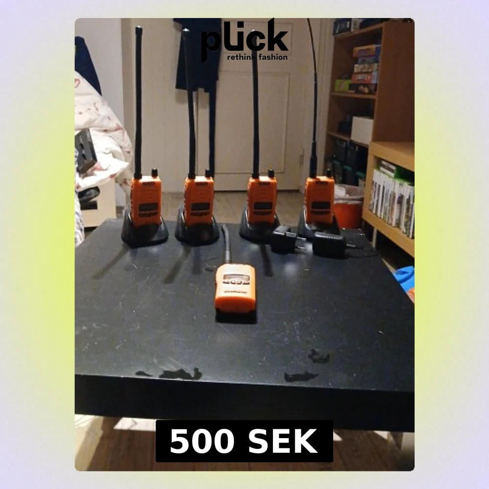Säljer ett set med fem orangea ConMaster CM-3185 walkie talkies. De har lång antenn, digital display och knappar för enkel hantering. Perfekt för kommunikation på event, spel eller utomhusaktiviteter.(Laddare medföljer 4 stykna )