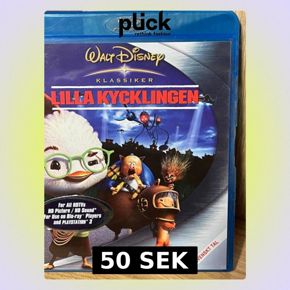 Blu-ray-film av Walt Disney, Lilla Kycklingen, i klassiker-serien. Omslaget är blått med färgglad tecknad framsida och svensk text. Innehåller extramaterial som borttagna scener och karaoke. Svenskt tal och flera språkval.