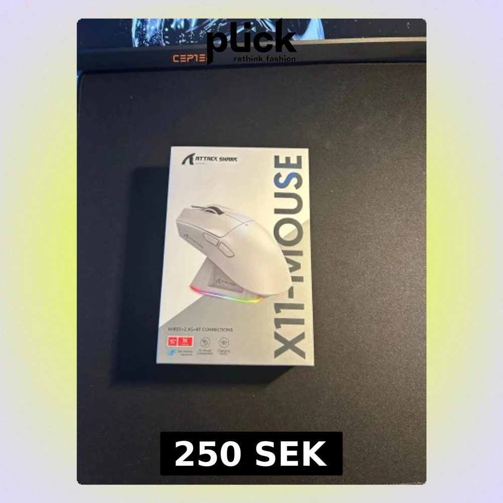 Säljer en vit Attack Shark X11 gamingmus med RGB-belysning. Musen har trådlös och trådad anslutning, flera sidoknappar och laddningsbar funktion. Perfekt för gaming och har en modern, stilren design i plast.