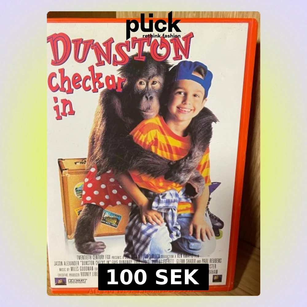 Rolig och färgglad VHS med titeln 'Dunston checkar in'. Omslaget visar en apa och en pojke framför resväskor. Filmen har ett rött omslag med stora, lekfulla bokstäver och illustrationer. Perfekt för dig som gillar humor och äventyr.