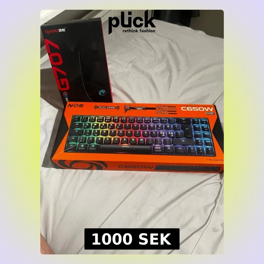 Säljer ett NOS C650W RGB tangentbord med snygg regnbågsbelysning och kompakt design, samt en RAIHU G707 gamingmus. Tangentbordet har svart plastchassi och färgglada LED-tangenter. Perfekt för gaming eller datoranvändning hemma.
