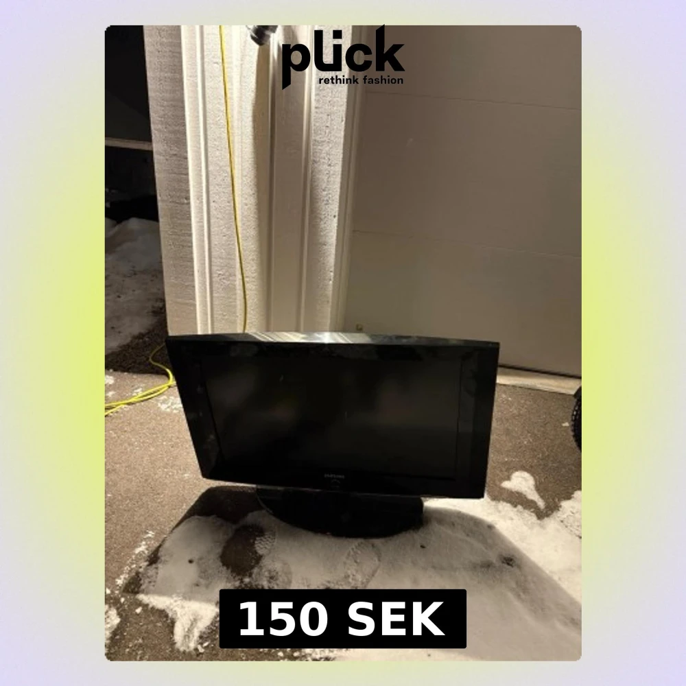 En svart platt TV från Samsung med bred ram och rund fot. Skärmen är rektangulär och har en stilren design som passar bra i de flesta rum. Perfekt för dig som vill koppla in spelkonsol eller använda som extra skärm.