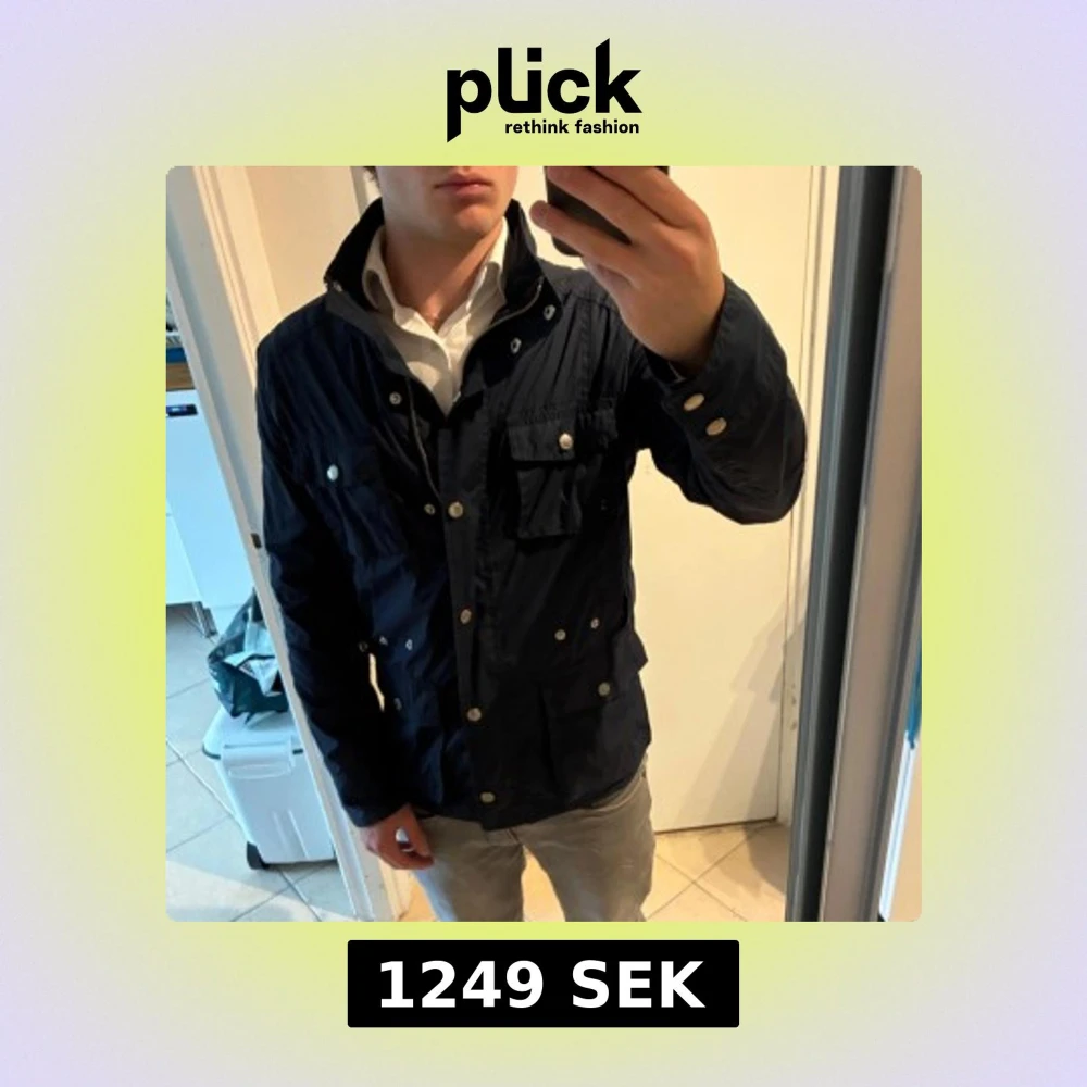 Snygg mörkblå vindjacka från Boomerang med flera fickor och silverfärgade knappar. Jackan har dragkedja framtill, hög krage och långärmade ärmar. Perfekt för dig som gillar stilren och funktionell design. Materialet är lätt och syntetiskt. Bra skick. Storlek 40, sitter som S