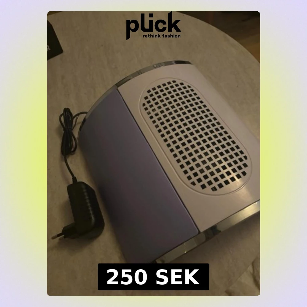 Elektrisk nageldammsugare med vit och lila design samt silvriga detaljer. Utrustad med galler för effektiv uppsamling av nageldamm och medföljande strömadapter. Perfekt för dig som vill hålla nagelstationen ren och fräsch under manikyr. Aldrig använt den.