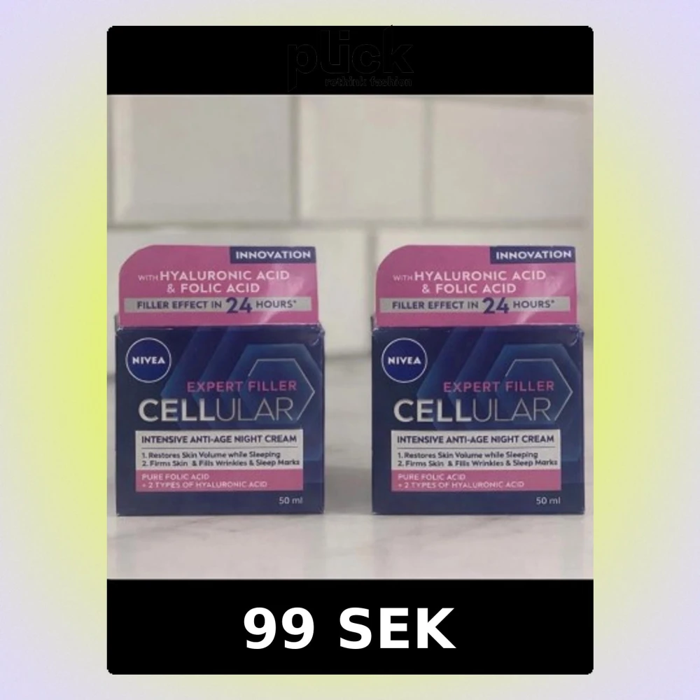 Nypris per styck är 239. Mitt pris är 99 kr styck Nivea Cellular Expert Filler Intensive Anti-Age Night Cream med hyaluronsyra och folsyra. Krämen kommer i en blå och rosa förpackning om 50 ml och är framtagen för att återställa hudvolym, strama upp huden och fylla ut rynkor under natten.