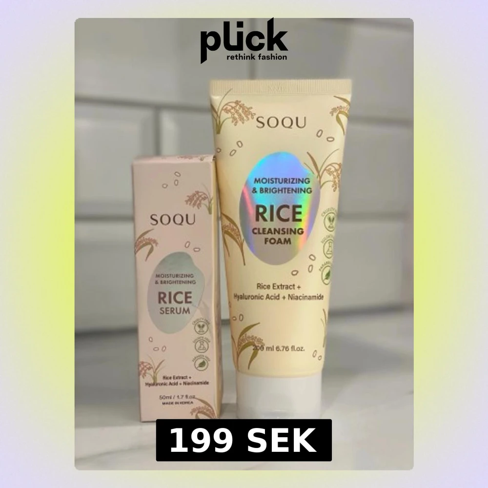 Fuktgivande och lystergivande set från SOQU med Rice Serum (50 ml) och Rice Cleansing Foam (200 ml). Båda innehåller risextrakt, hyaluronsyra och niacinamid. Förpackningarna är ljusa med guldiga detaljer och har en modern, stilren design. Nypris 449 mitt pris 199