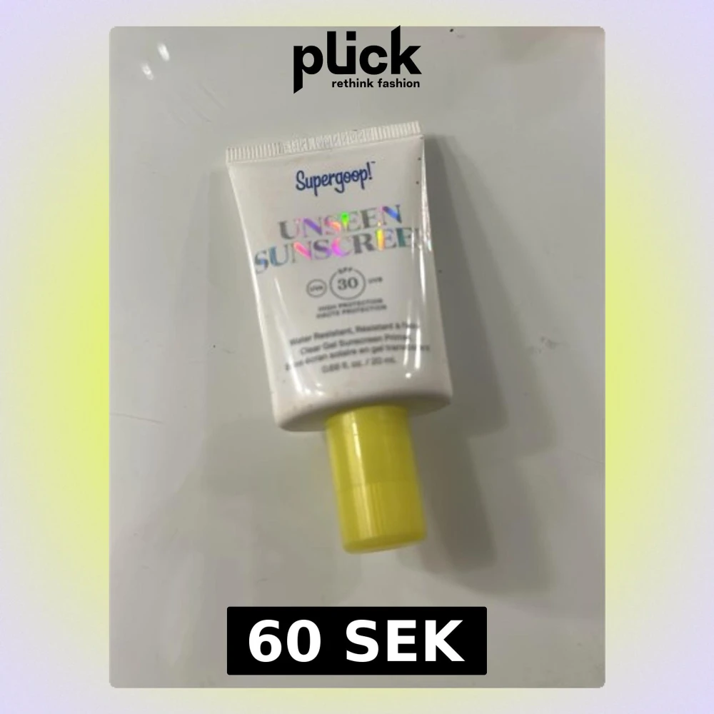 Transparent solskyddsgel från Supergoop! med SPF 30. Tuben är vit med holografisk text och har ett gult lock. Produkten är vattenresistent och passar perfekt för dagligt skydd mot solen.
