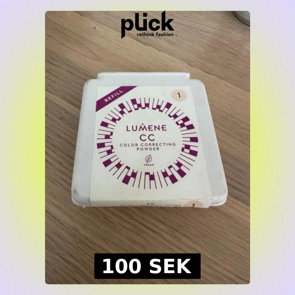 Lumene CC Color Correcting Powder refill i nyans 1. Pressat puder i ljus beige ton, rund form och vegansk formula. Förpackningen är vit, fyrkantig och tillverkad av biologiskt nedbrytbart material.