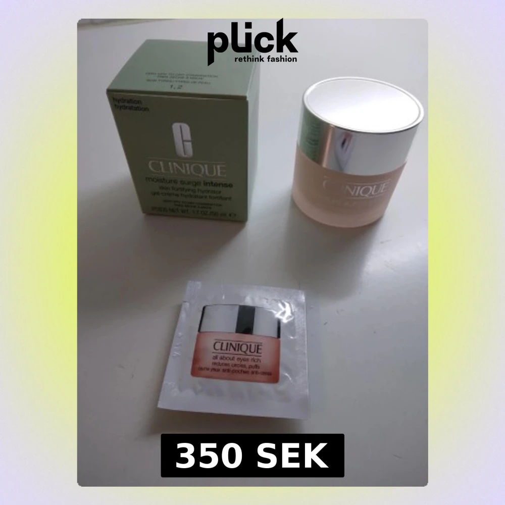 HELT NY Clinique Moisture Surge Intense hudkräm, 50 ml. Är en populär klassisk oljefri gel-creme som återfuktar och stärker hudens fuktbarriär. Passar mycket torr till kombinerad hud och innehåller aloe vera. Produkten är parfymfri och kommer i en ljusgrön kartong med gratisprov av matchande ögonkräm som ingår i köpet. Har stått en tid sedan inköpet men är helt oanvänd. Se bilder för egen bedömning. Nypris I butik för 50 ml: 449 kr.