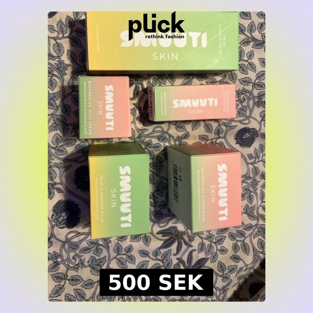 Flera oanvända hudvårdsprodukter från Smuuti Skin i pastellfärgade förpackningar. Innehåller bland annat rengöringsgel och balm med päron och vattenmelon. Förpackningarna är i grönt, gult och rosa och har en modern, stilren design. Perfekt för dig som gillar färgglad hudvård.