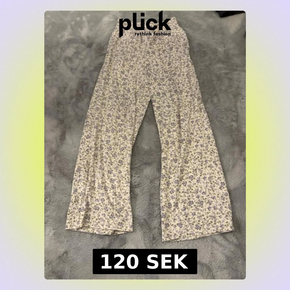 Säljer ett par supermysiga, vida byxor med lila och grönt blommönster på ljus botten. Byxorna har resår i midjan och praktiska fickor på sidorna. Perfekta för chill dagar eller när du vill ha en söt och avslappnad look.