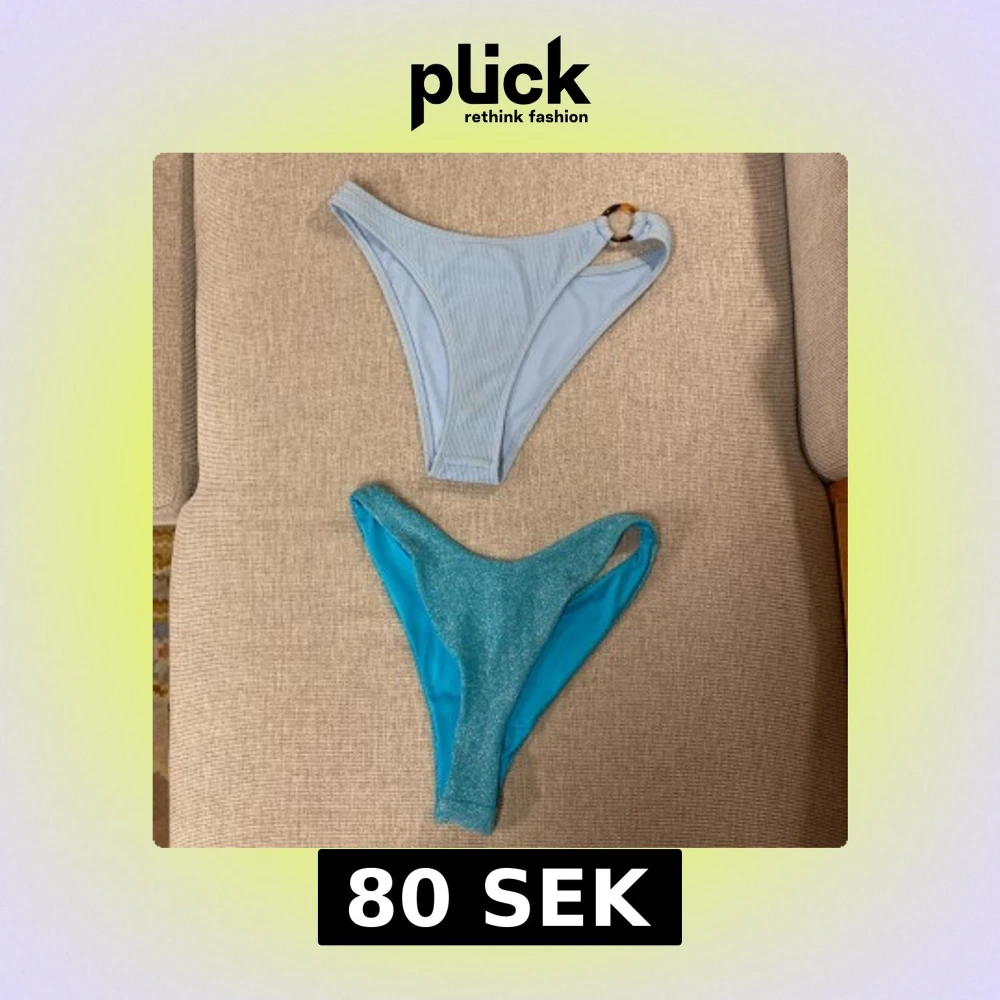 Säljer två blå bikiniunderdelar från Bik Bok. En ljusblå ribbad med ringdetalj i sidan och en glittrig turkosblå med ännu högre midja. Båda för 80kr eller den ena för 40kr!