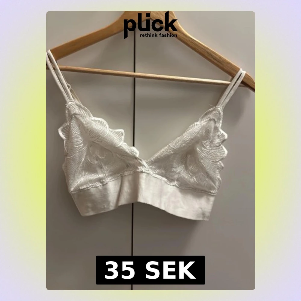 Säljer en vit bralette med vackra spetsdetaljer och dubbla smala axelband. Bh:n har dekorativa vågiga kanter och bred resår under bysten för extra stöd. Justerbara axelband och hakknäppning bak. Materialet är en mix av spets och satinliknande tyg.