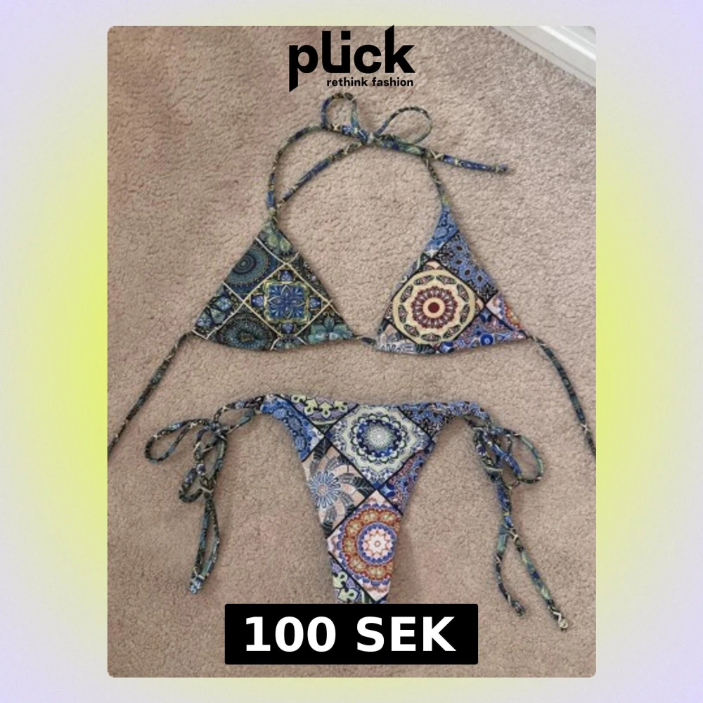 Säljer en snygg bikini med färgglada mönster i blått, grönt, gult och rött. Klassisk trekantsmodell upptill och knytband både på toppen och trosan.