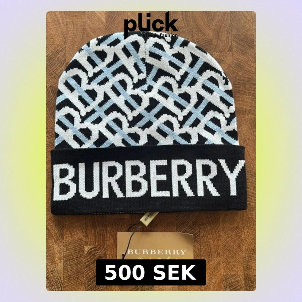 Svart Burberry mössa med logga - Säljer en svart mössa från Burberry med stor vit logga runt om. Mössan är ribbstickad och har en bred kant med tydlig text. Perfekt accessoar för dig som vill ha en stilren och lyxig look.