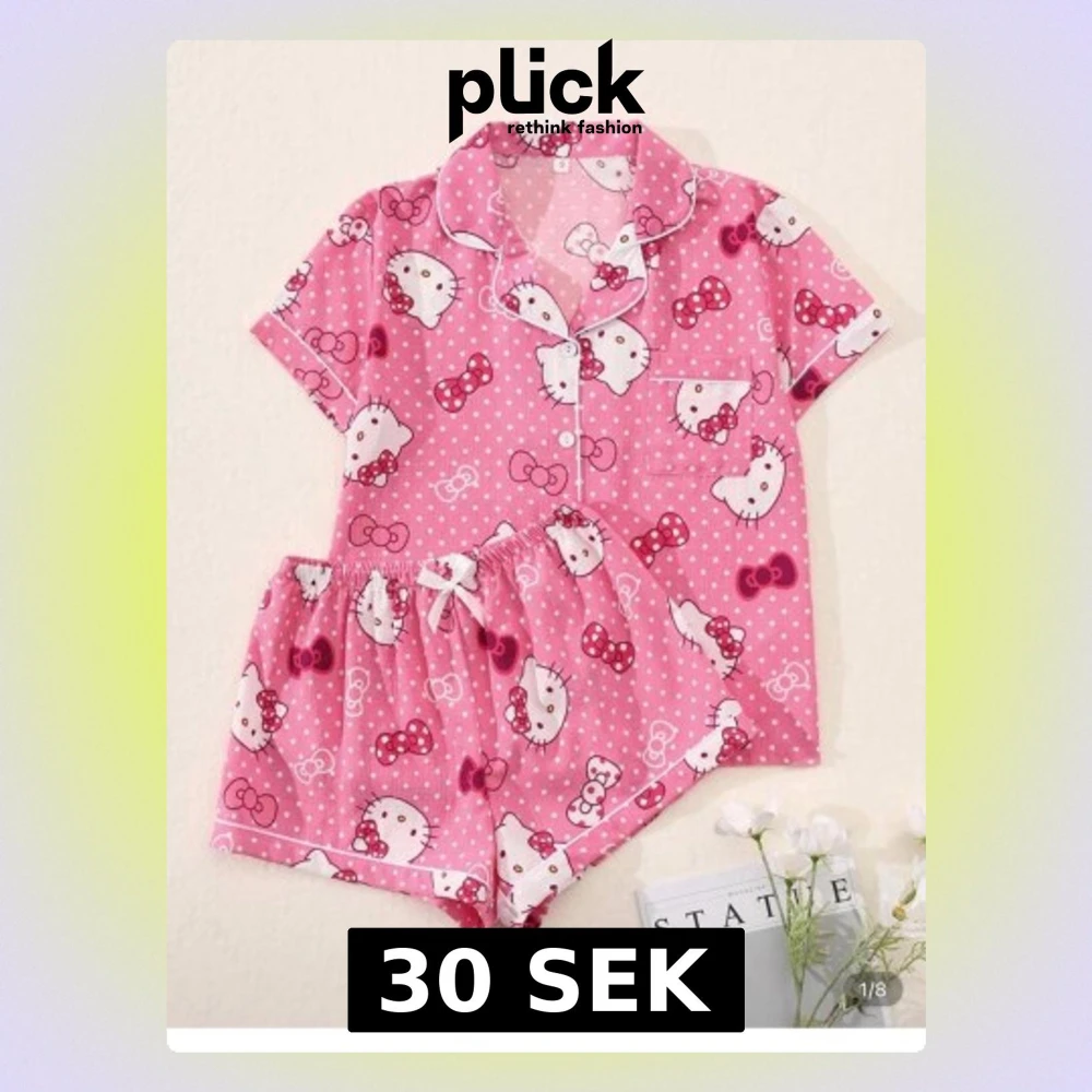 Supergulligt rosa pyjamas-set med Hello Kitty-motiv och vita prickar. Setet består av en kortärmad skjorta med knappar och bröstficka samt matchande shorts med resår i midjan.