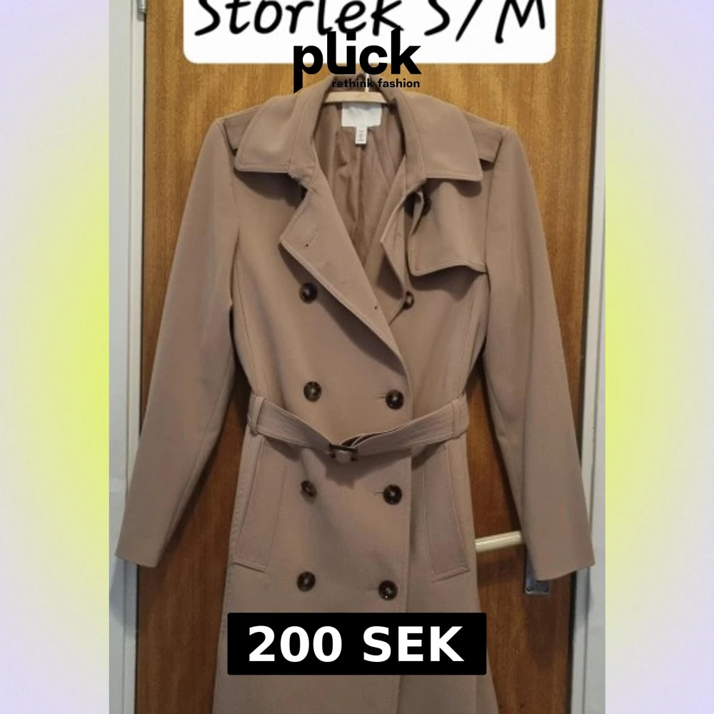 Snygg beige trenchcoat från H&M i storlek S/M. Jackan har klassisk dubbelknäppning, krage och bälte i midjan för en stilren look. Perfekt för dig som gillar tidlös design och vill ha en jacka som funkar till många outfits.