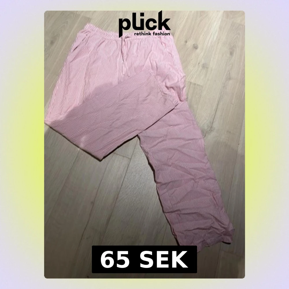 Säljer ett par pyjamasbyxor i mjukt tyg med rosa och vita smala ränder. Byxorna har resår i midjan och är långa i modellen, perfekta för mysiga hemmakvällar. Klassisk och enkel design som passar alla.