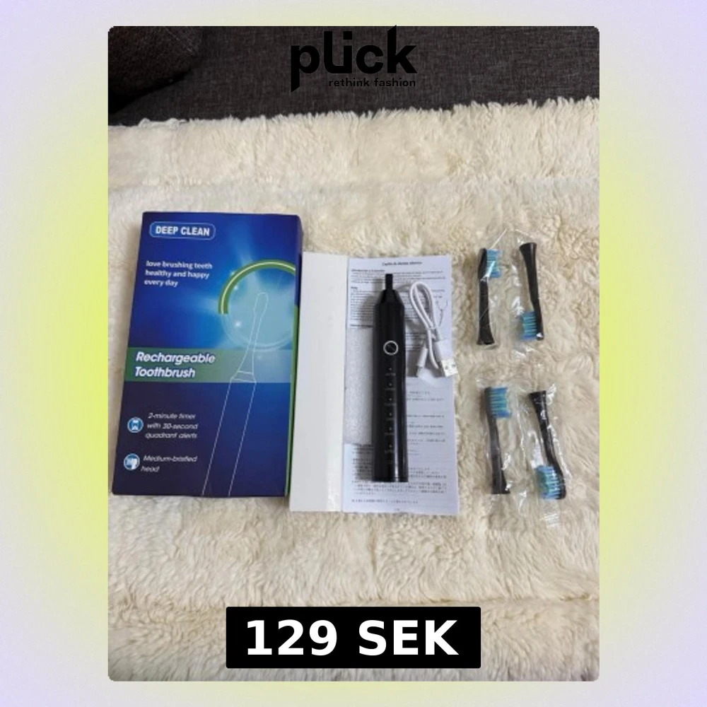 Elektrisk tandborste i svart från Deep Clean med 4 st borsthuvuden, USB-laddkabel och olika borstlägen. Borsthuvudena har blå och vita strån. Levereras med originalförpackning och instruktioner. Helt ny aldrig använd.