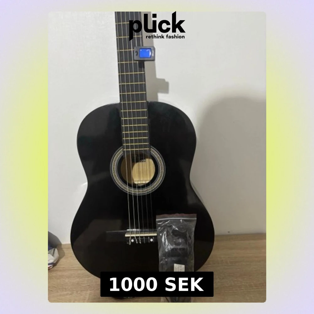 Säljer en svart akustisk gitarr med klassisk form och ljus ljudhålskant. Medföljer digital stämapparat från Amex och reserv stämband, helt nytt aldrig använd bara testad. Ny pris 1995kr, perfekt för nybörjare