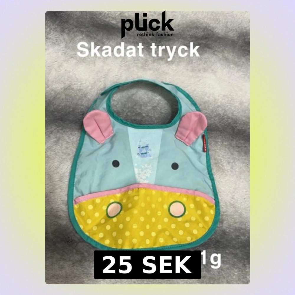Söt haklapp från Skip Hop med ett djurmotiv i blått, gult och rosa. Haklappen har rosa öron, gul prickig nederdel och gröna detaljer. Perfekt för att göra måltider lite roligare.🌸 Skadat tryck efter tvätt.
