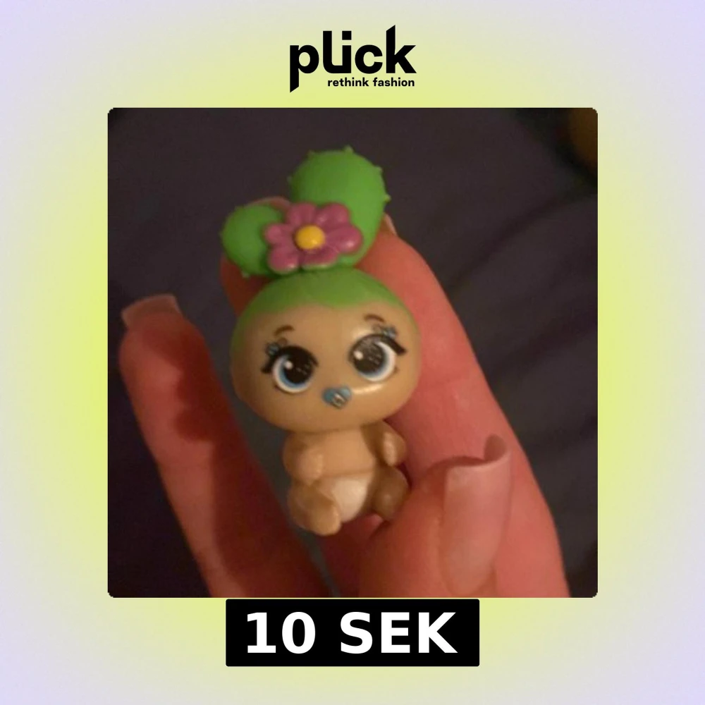 En liten figur med grönt hår och en rosa blomma på huvudet. Figuren har stora ögon och en napp i munnen. Den bär en vit blöja och har en söt, tecknad stil.