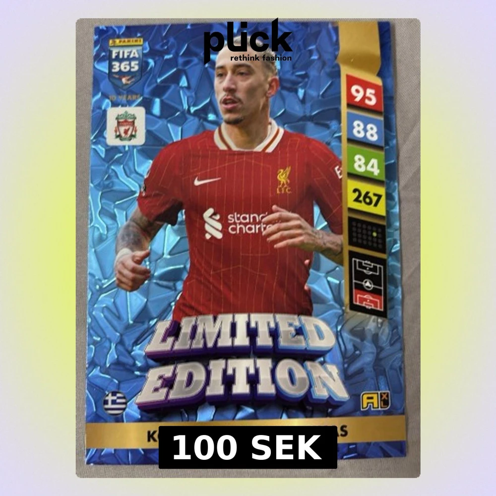 Samlarkort från Panini FIFA 365-serien, Limited Edition med Konstantinos Tsimikas i Liverpool-tröja. Kortet har blå skimrande bakgrund, spelarstatistik och officiella loggor. Perfekt för dig som gillar fotboll och samlarkort. Kortet är även XL storlek. Köparen står för frakten.
