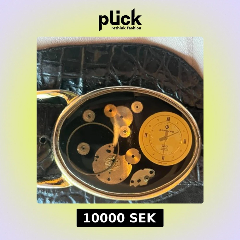 Unikt svart bälte med en dekorativ urtavla från Candino. Bältet har en krokodilpräglad yta och ett spänne i guldton. Urtavlan är detaljerad med synliga kugghjul och romerska siffror.