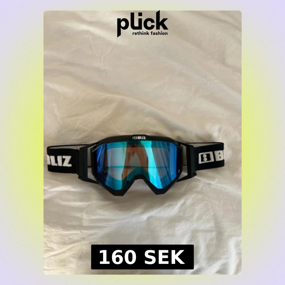 Säljer ett par svarta skidglasögon från Bliz med speglande blått glas och justerbart svart band med vit logga. Pris kan diskuteras