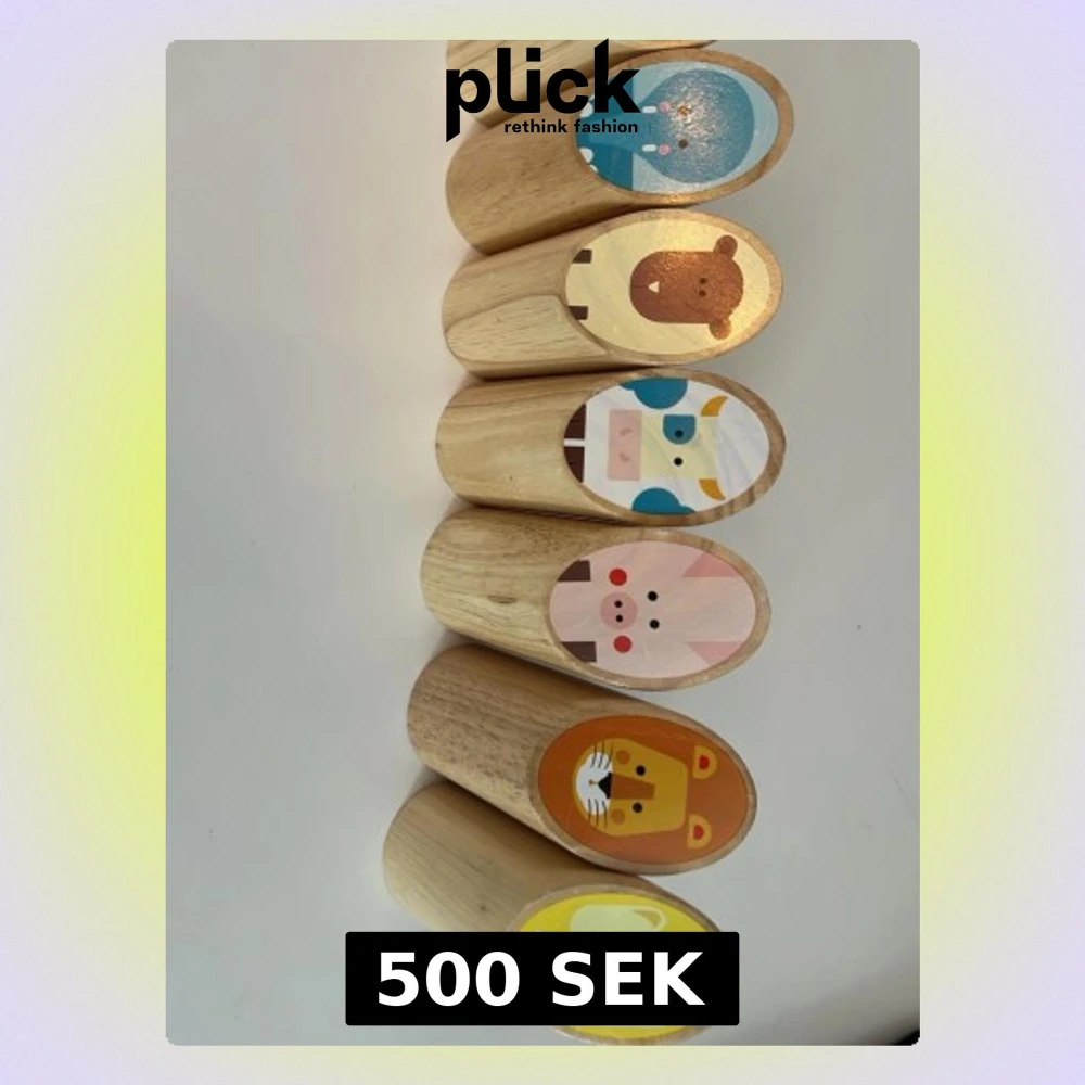 Sex stycken ovala träklossar med färgglada djurmotiv på ena sidan. Motiven inkluderar blå elefant, brun björn, vit och blå ko, rosa gris, orange lejon och gul katt. Klossarna är tillverkade i ljust trä och har en slät, rundad form som är skön att hålla i.
