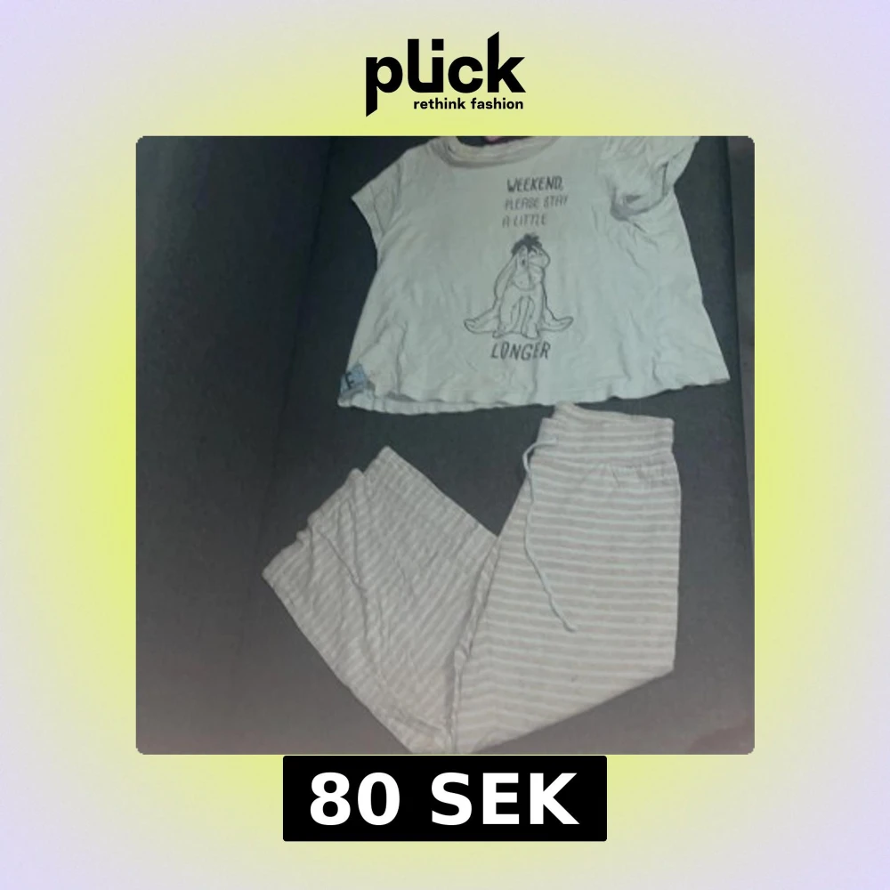 Pyjamas T-shirt med korta ärmar + byxor och ett gulligt Ior-tryck från Nalle Puh på framsidan. Texten 'Weekend, please stay a little longer' ger en chill vibe. T-shirten har en avslappnad passform och är gjord i mjuk bomull, perfekt för att hänga hemma.