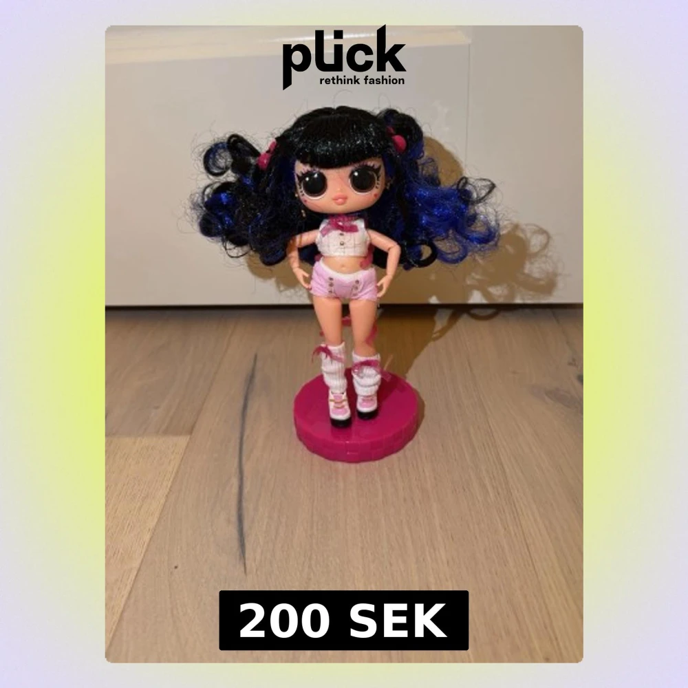 Säljer en cool docka med svart och blått lockigt hår, klädd i rosa topp och shorts, vita benvärmare och rosa skor. Dockan står på en rosa ställning och har små rosa detaljer i håret. Perfekt för dig som gillar att samla eller leka med dockor. Du får även med 1 hårborste, 1 fön, 2 par klädesplagg, 1 ryggsäck, 1 halsband samt 1 par solbrillor.