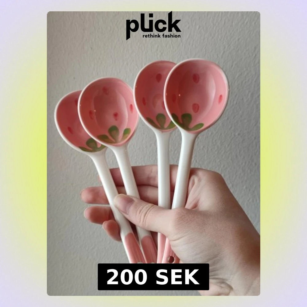 HandmÄlade jordgubbsskedar i keramik. SmÄ skillnader i fÀrg/motiv kan förekomma. Skedarna har ett sött jordgubbsmotiv och Àr perfekta för flingor, yoghurt eller bowls. Eller varför inte soppa? Skedarna Àr helt nya! VÀlkommen att fynda!