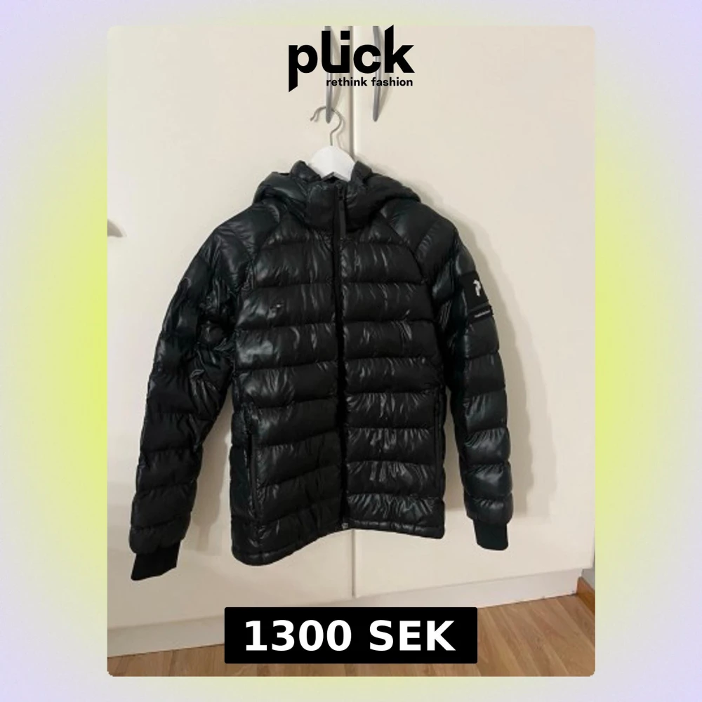 hej! säljer den här svarta peak jackan i storlek 170 då den inte används längre, den är i fint skick förutom två små hål som syns på bilderna men det är inget man tänker på när man använder den.