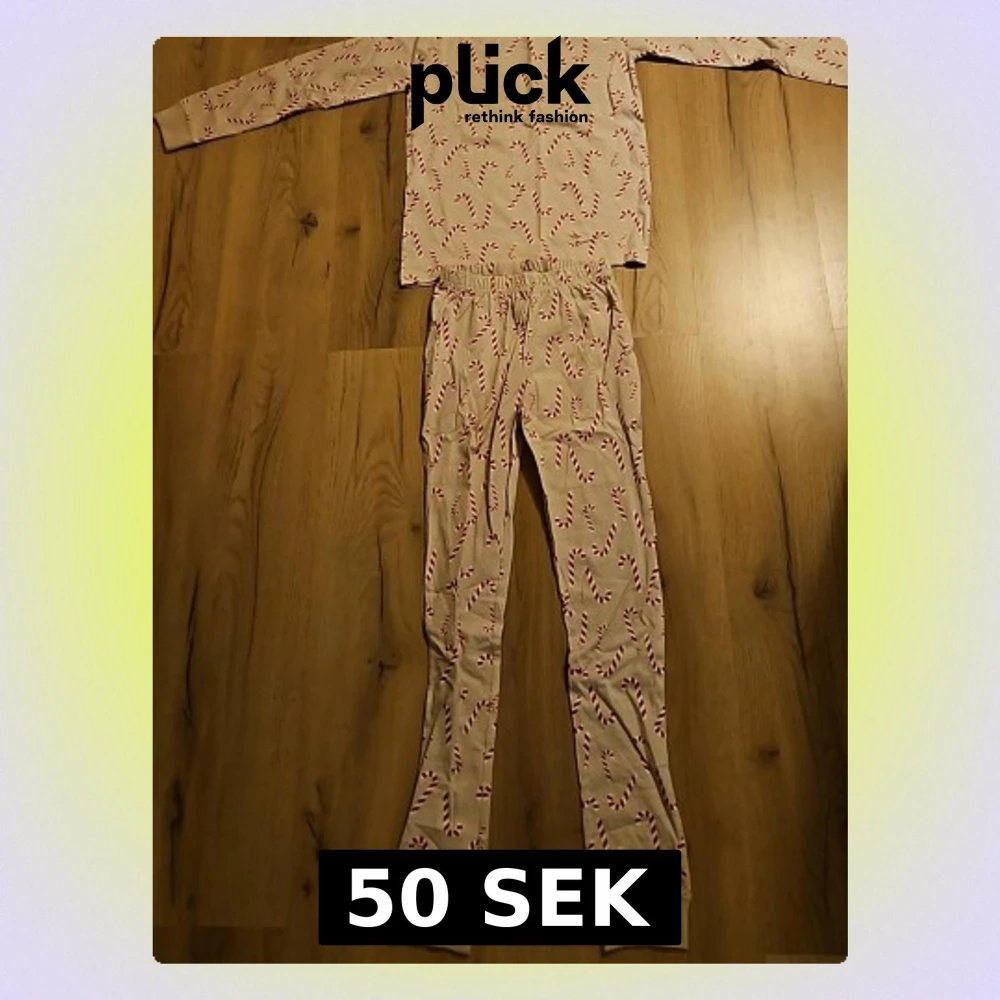 Mysig tvådelad jul pyjamas i beige med rött och vitt polkagris-mönster. Setet har långärmad tröja och långa byxor med resår i midjan och muddar vid bensluten. Perfekt för julmys och chillkvällar hemma. Aldrig använd!! Var inte ett fan av pjamas när jag var liten.