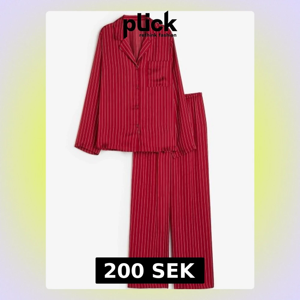 Snygg pyjamas i rött med vita smala ränder. Setet består av en långärmad skjorta med knappar och bröstficka samt matchande byxor med rak passform. Perfekt för mysiga kvällar hemma.