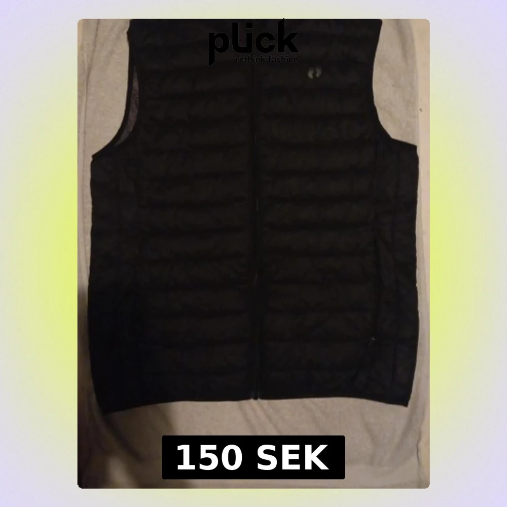 Säljer en svart dunväst med horisontella quiltade sömmar och hel dragkedja framtill. Västen har en enkel och stilren design utan synliga fickor eller extra detaljer. Perfekt att slänga över en hoodie eller tröja för extra värme.