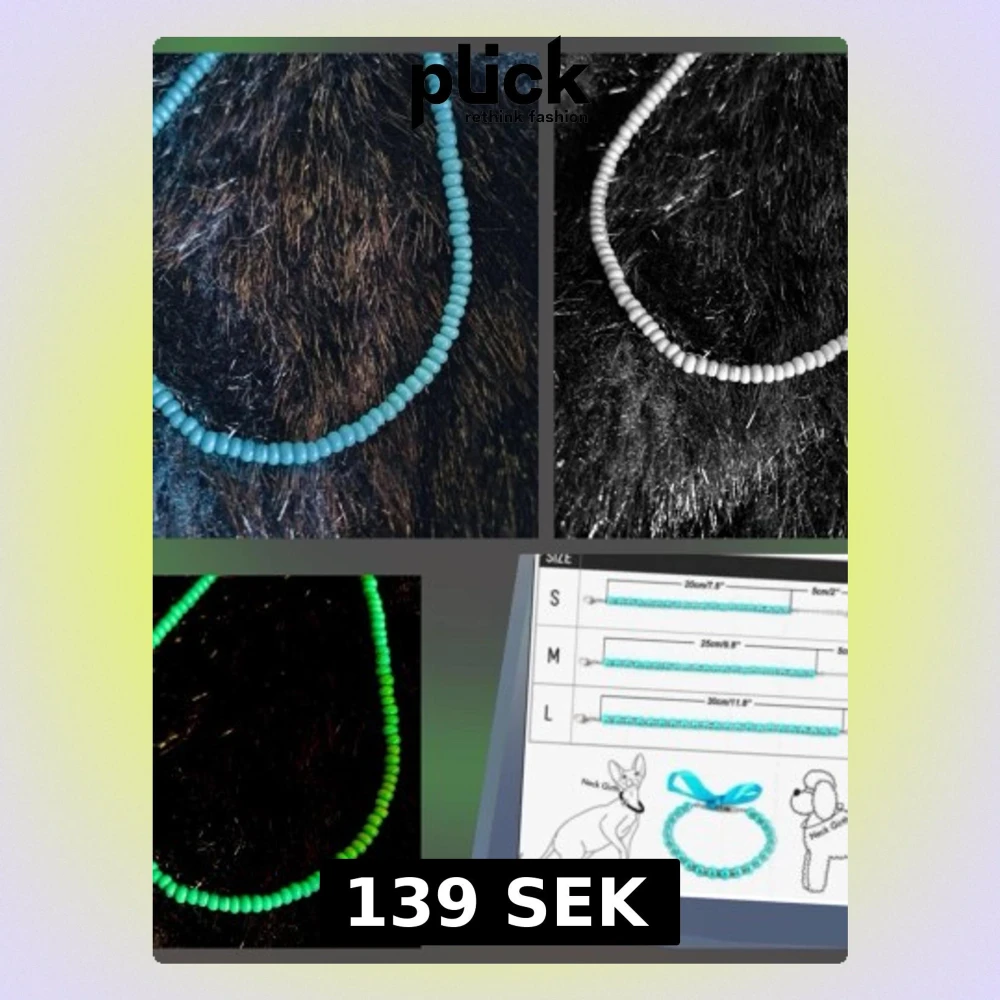 Katt/hund halsband storlek Small med små, runda gröna/turkosa eller vita pärlor i enkel och stilren design. Det passar perfekt för dig som vill ha något unikt och färgglatt. De finns i olika storlekar enligt storleksguiden på bilden.