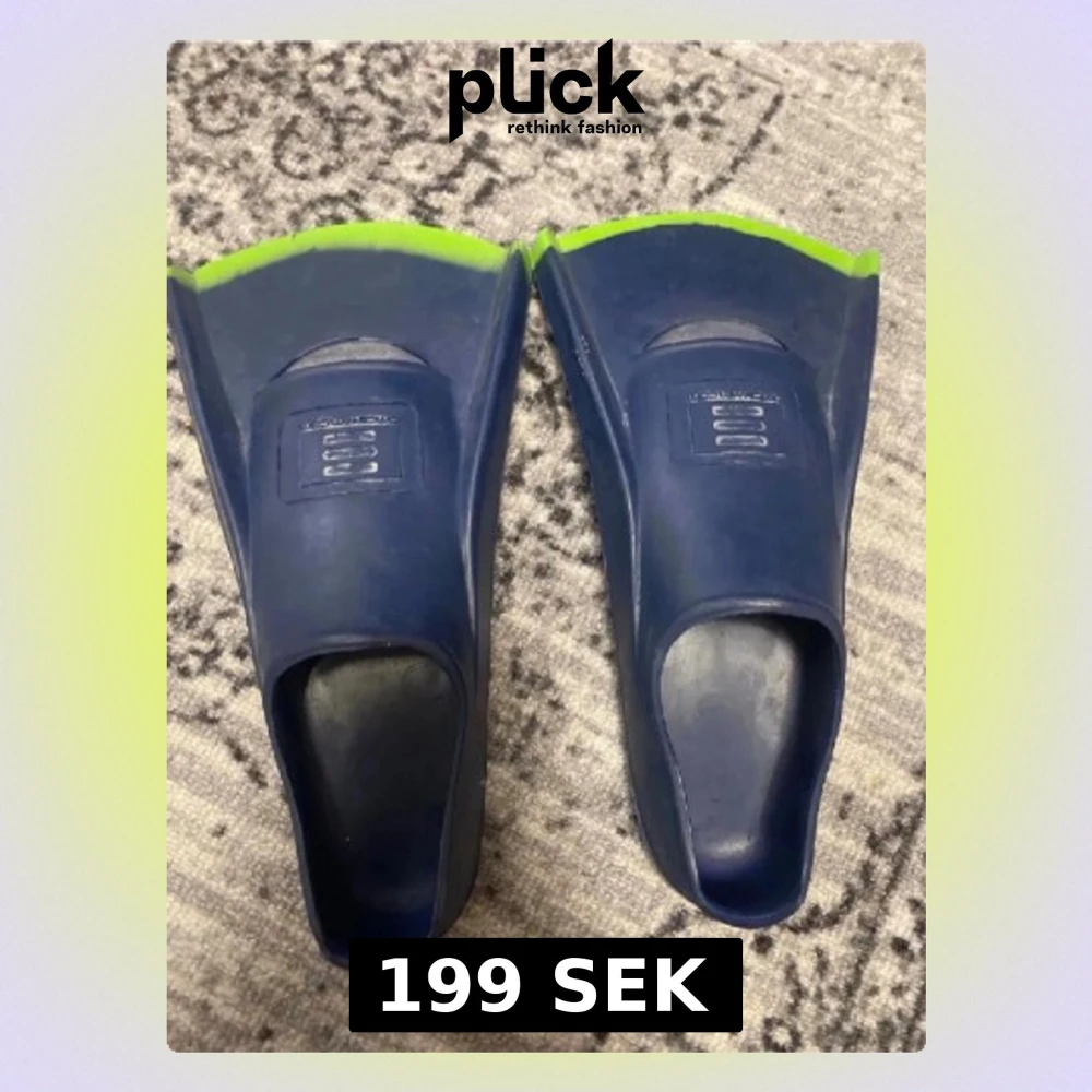 Säljer ett par blå simfenor med gröna kanter, perfekta för simträning eller snorkling. Tillverkade i gummi för bra komfort och grepp. Märkta med storlek 40-41 och tillverkade i Malaysia. Snygg och sportig design som passar dig som vill ta simningen till nästa nivå.