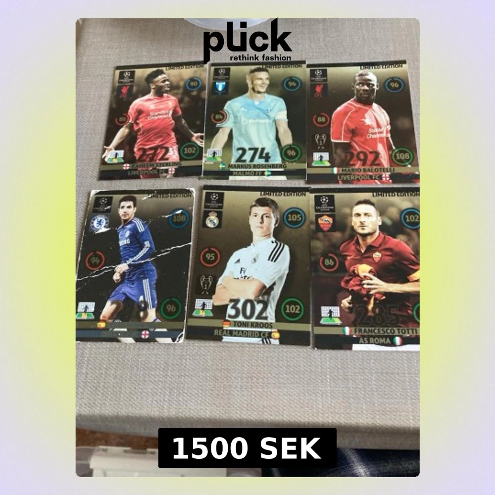 Säljer en samling Limited Edition fotbollskort från Champions League med spelare från lag som Liverpool, Real Madrid, Chelsea, Bayern München och fler. Korten har färgstarka bilder, guldiga detaljer och statistik på framsidan. Perfekt för dig som gillar att samla fotbollsprylar!