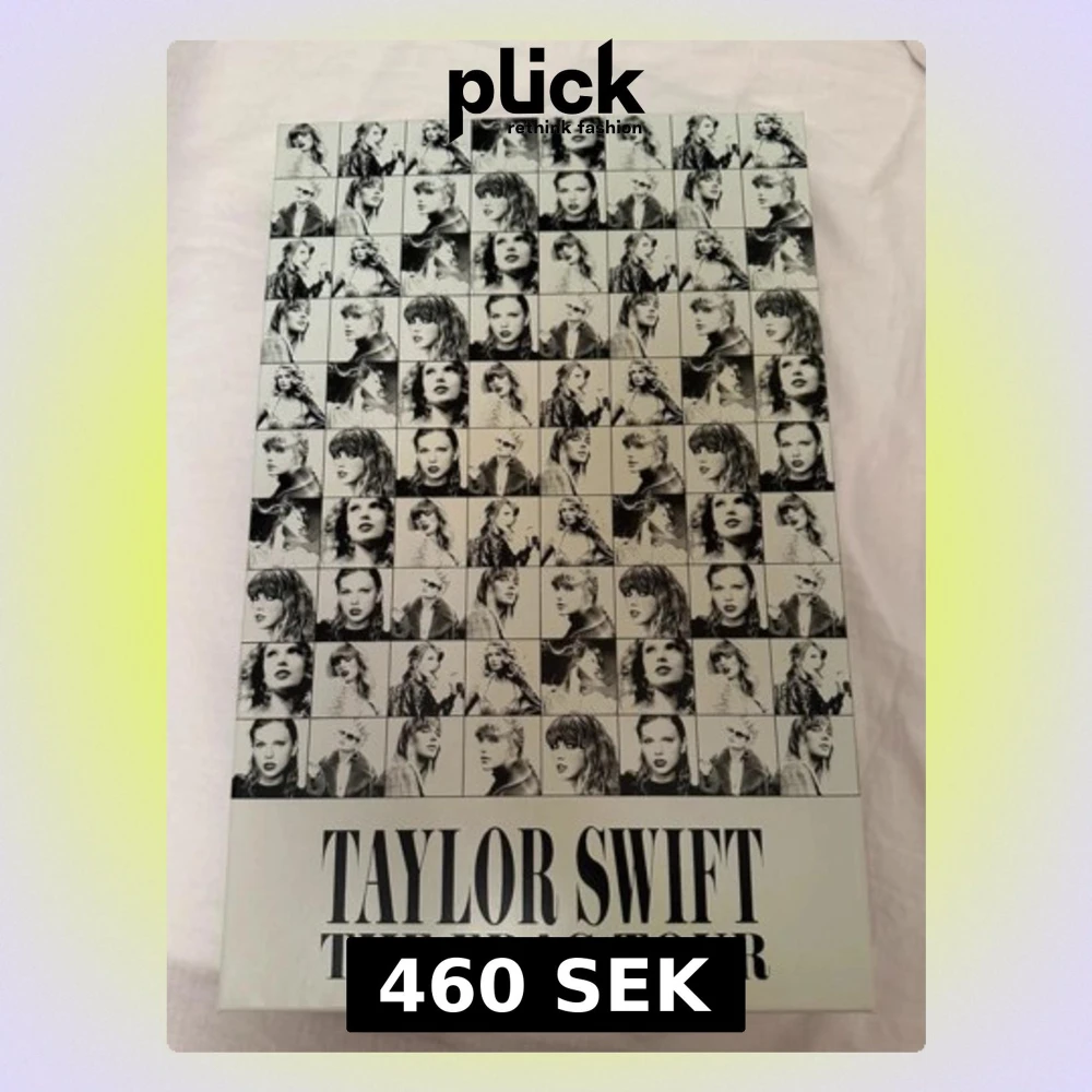 Säljer en merch box från Taylor Swift The Eras Tour. Boxen innehåller en tygpåse, vykort, stickers, VIP-pass och posters med olika bilder på Taylor Swift.
