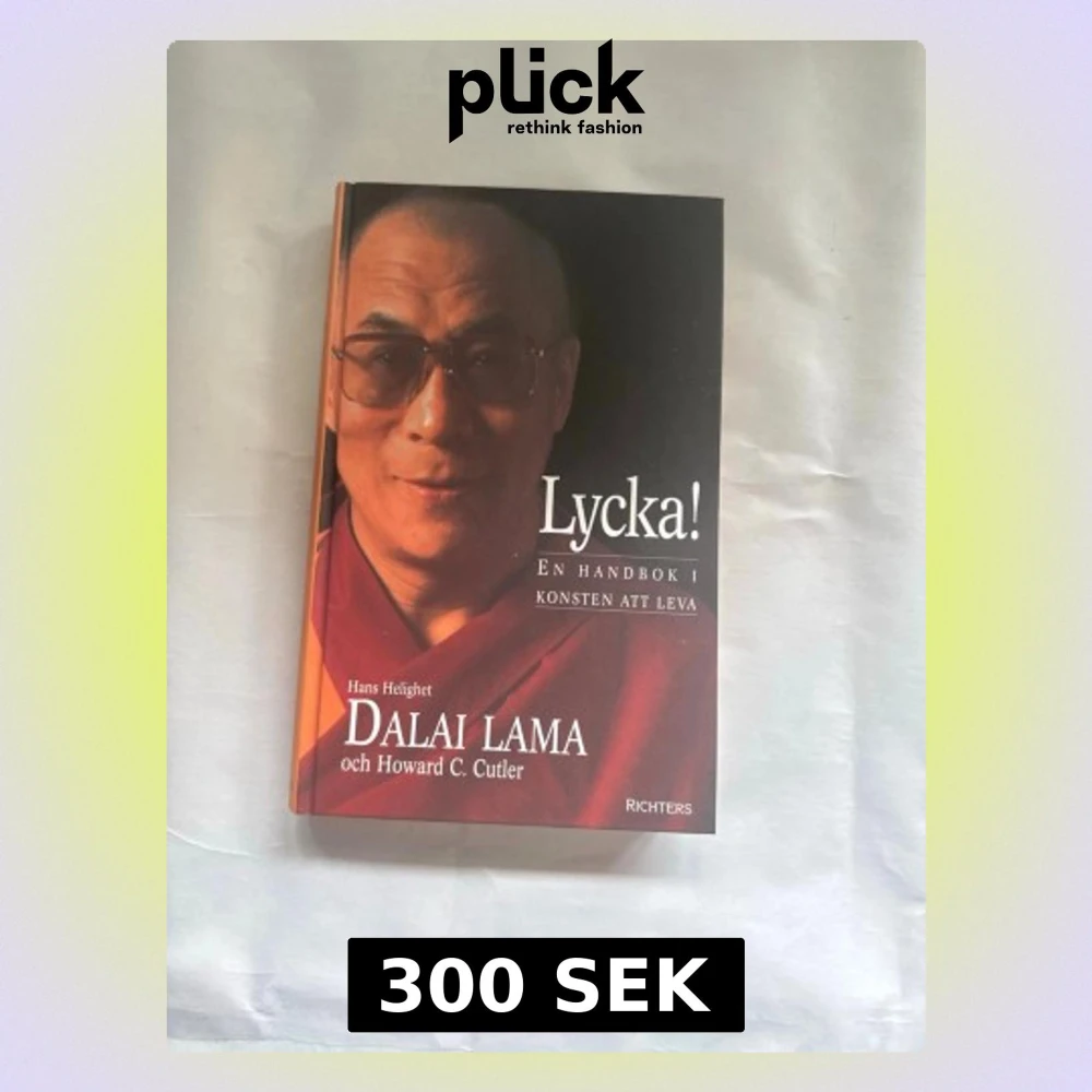 En bok med titeln 'Lycka! En handbok i konsten att leva' av Dalai Lama och Howard C. Cutler. Omslaget är i röd, svart och orange ton med vit text. Boken är inbunden och har ett porträtt på framsidan. Perfekt för dig som vill läsa om livsfilosofi och personlig utveckling.