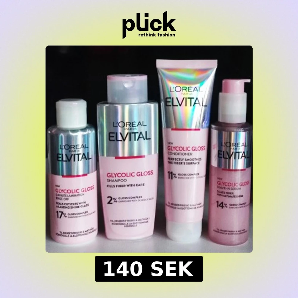 L'Oréal Elvital Glycolic Gloss: Lamination 200ml, Shampoo 200ml, conditioner 150ml, serum 150ml. Nytt i oöppnad förpackning. Priset är för 4 produkter.