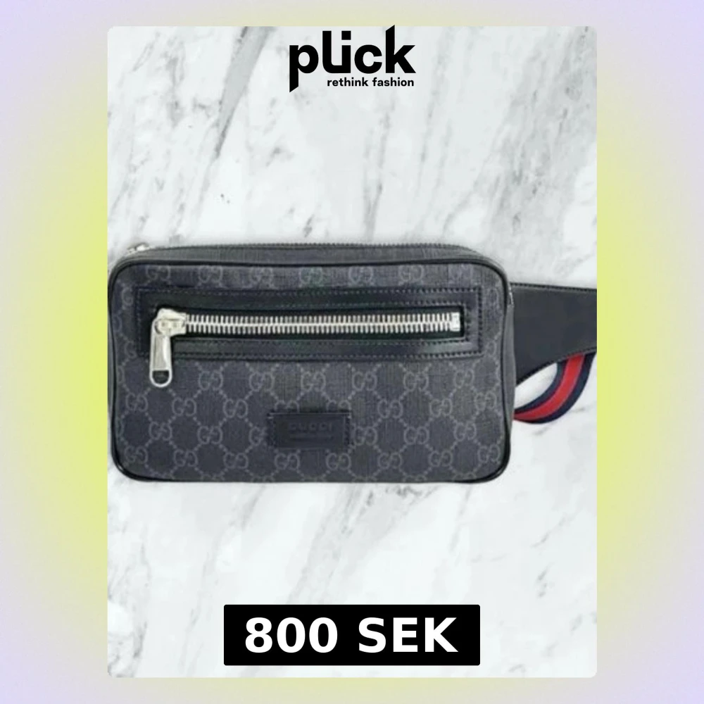 Snygg svart magväska från Gucci med klassiskt GG-monogram i grått. Väskan har ett stort fack med dragkedja framtill och justerbart band i rött och marinblått. Tillverkad i canvas med läderdetaljer och silverfärgad dragkedja. Perfekt accessoar för att hålla koll på dina grejer.