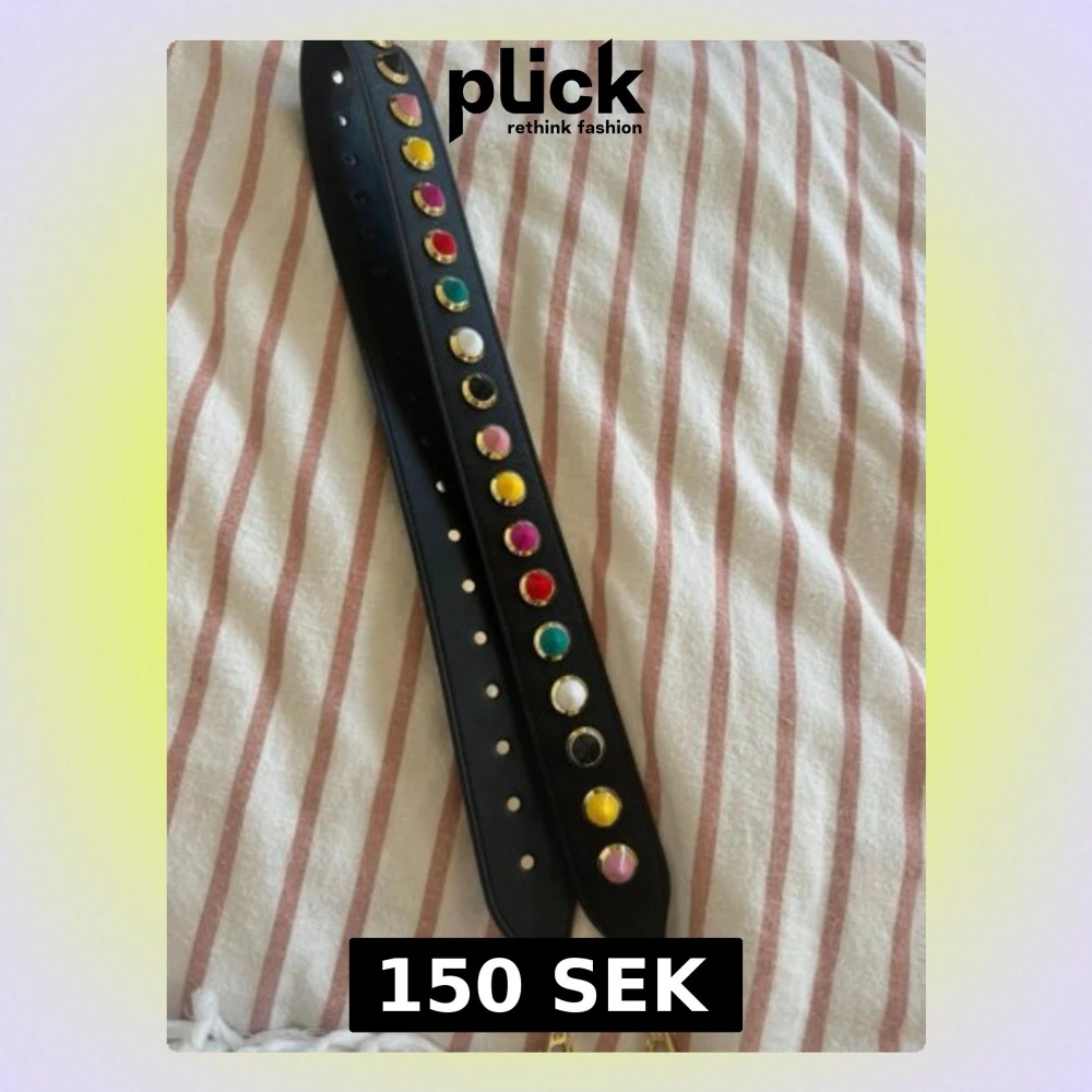 105cm. Snygg svart axelrem i konstläder från Gabrielle by P, dekorerad med färgglada runda nitar i gult, rosa, rött, grönt, vitt och svart. Remmen har guldfärgade metalldetaljer och karbinhakar för enkel fastsättning på väska.