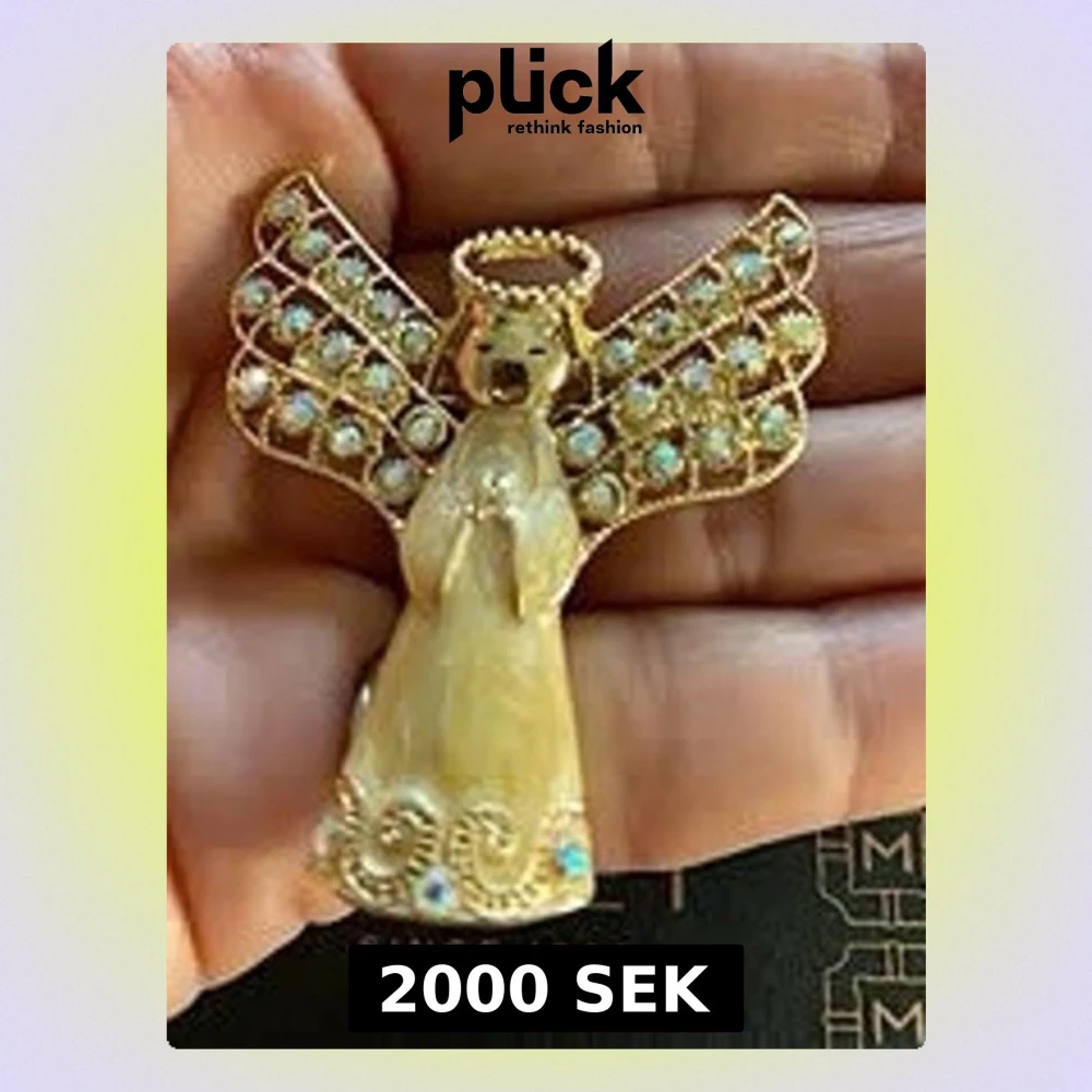 Unik brosch formad som en ängel med skimrande pärlemor och guldfärgade detaljer. Vingarna är dekorerade med små gnistrande stenar i vitt och blått. Monet sin e 1929 ängel brosch i guldpläterat material för unisex. Broschen föreställer en ängel med utbredda vingar dekorerade med ljusa stenar. Hög 5cm. Framsidan har en ljus, pärlemorskimrande klänning av emalj och detaljerad utformning av huvud, gloria och vingar. Baksidan är helt guldplätera