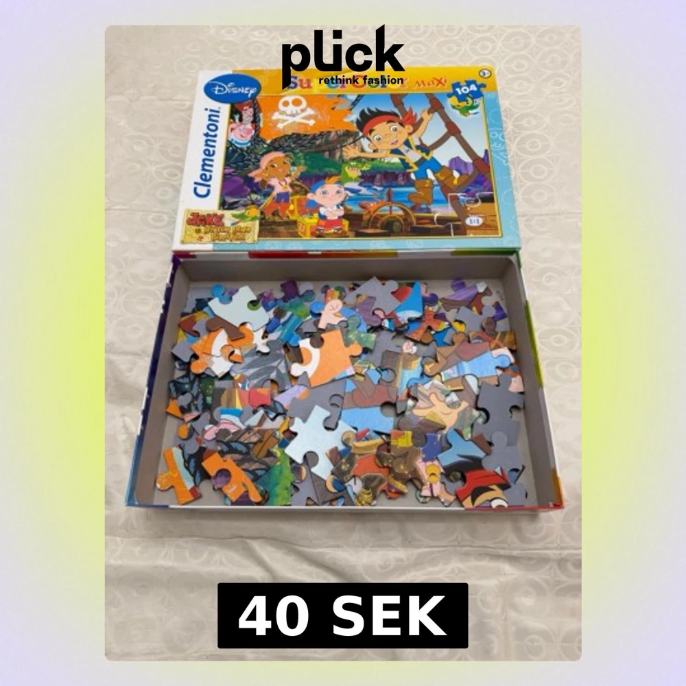 Färgglatt pussel med motiv från Disney-serien Jake och piraterna från Landet Ingenstans. Pusslet har 104 bitar och kommer i en låda med illustrationer av karaktärerna. Passar barn från 3+