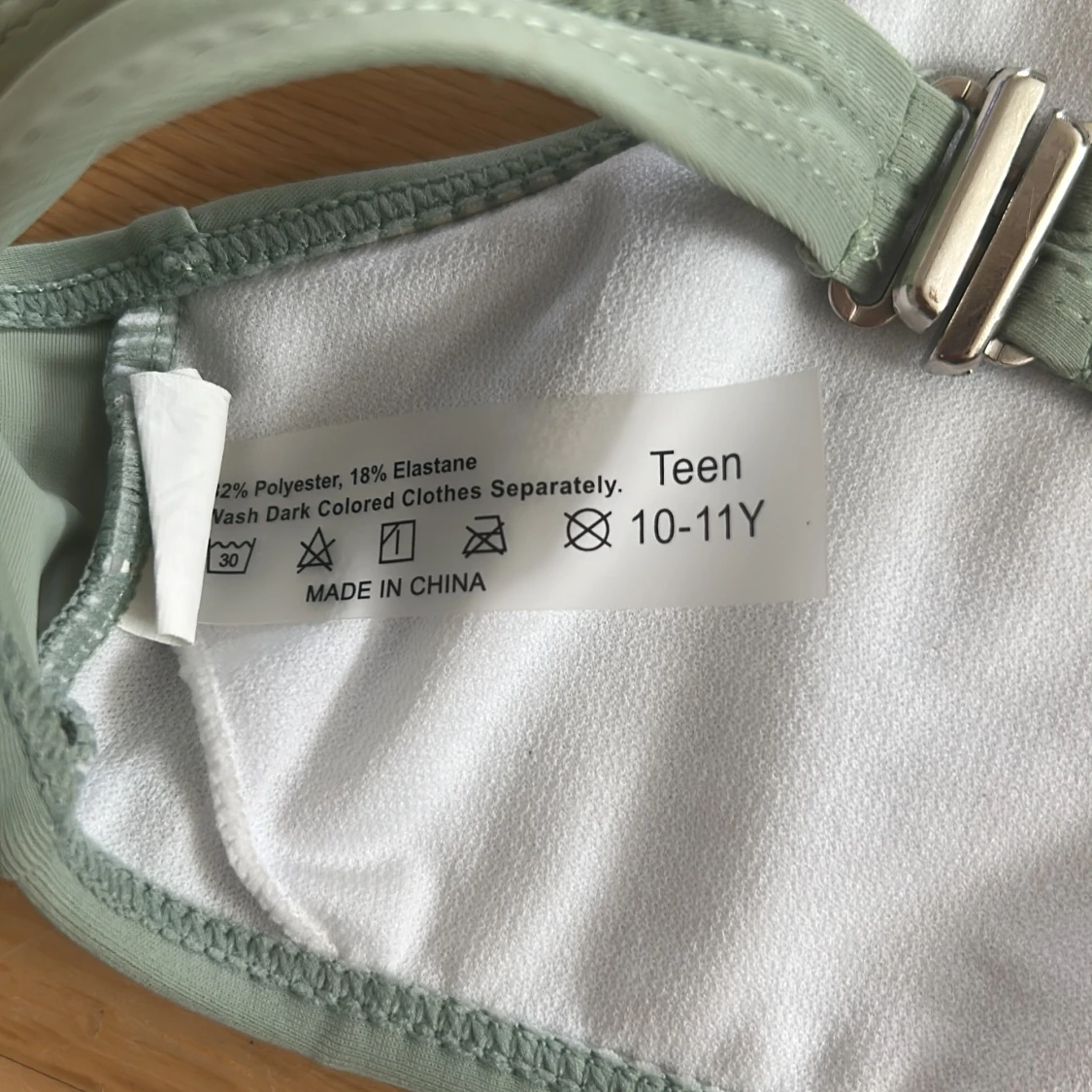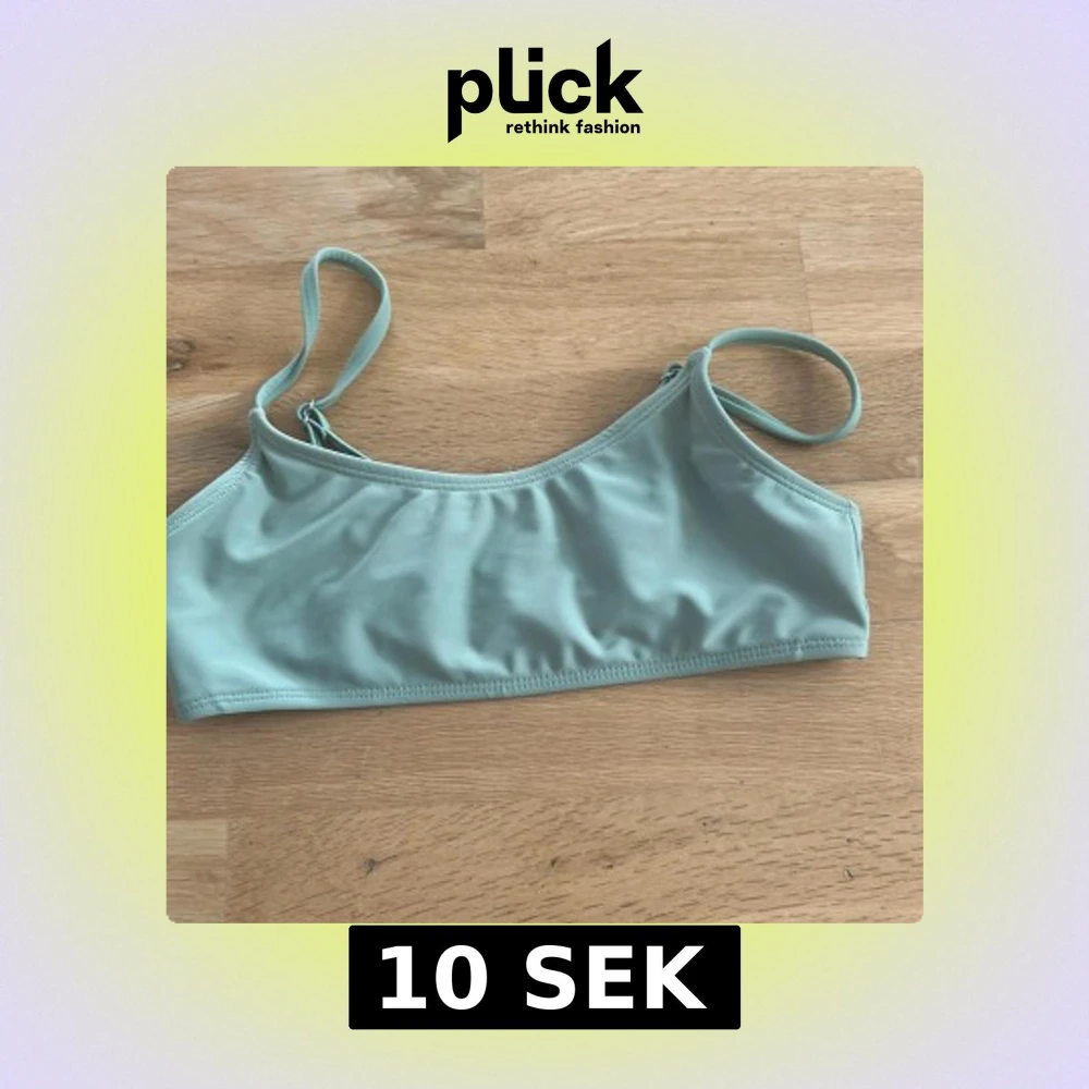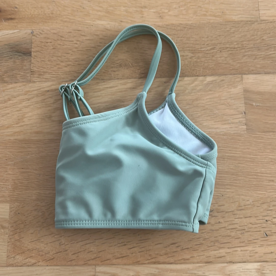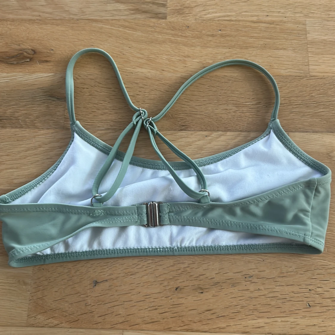 Snygg ljusgrön bikiniöverdel med smala axelband och enkel spänne i ryggen. Modellen är sportig och stilren, perfekt för strand eller pool. Tillverkad i mjuk och stretchig polyesterblandning för skön passform.