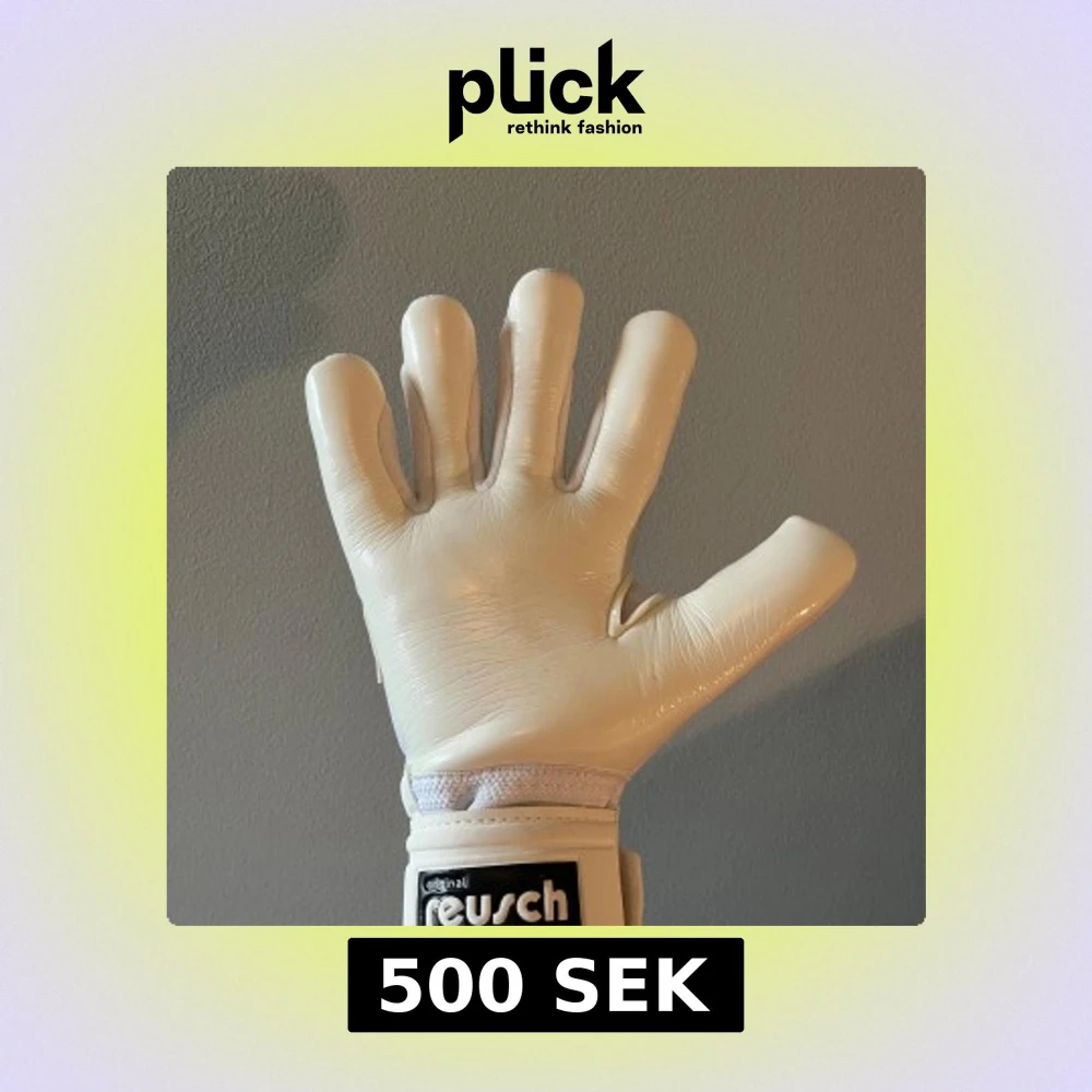 Säljer ett par vita målvaktshandskar från Reusch med svart logga och detaljer. Handskarna har breda kardborreband vid handleden och förstärkta fingrar för extra skydd. Greppvänlig insida i latex och klassisk design, perfekta för fotbollsmålvakter. Helt nya storlek 10 och pris 500kr